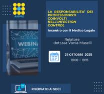 L’incontro, dal titolo “La responsabilità dei professionisti coinvolti nell’Infection Control. Incontro con il medico legale”, si terrà mercoledì 29 ottobre 2025, dalle ore 18:00 alle 19:15 con la partecipazione della Dott.ssa Vania Maselli.